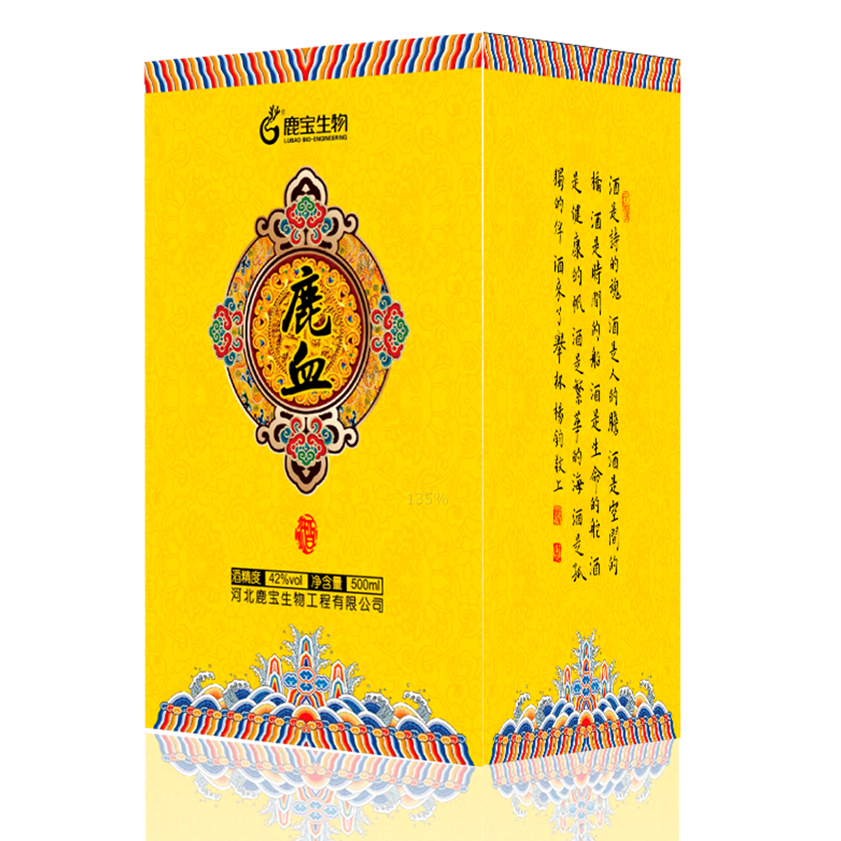 【配 料】水、濃香型基酒(高粱、小麥、大麥、玉米、豌豆)、蛹蟲(chóng)草、鹿血、人參(人工種植,三年及三年以下)、枸杞子、大棗、葛根、姜黃、紅曲米