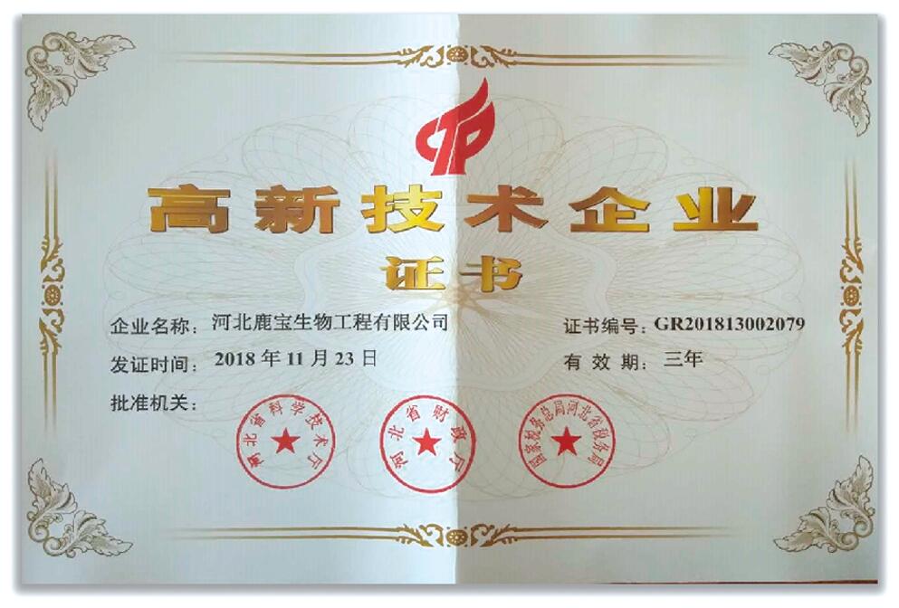 經(jīng)省科委審評,河北鹿寶生物工程有限公司成為國家高新技術(shù)企業(yè)。