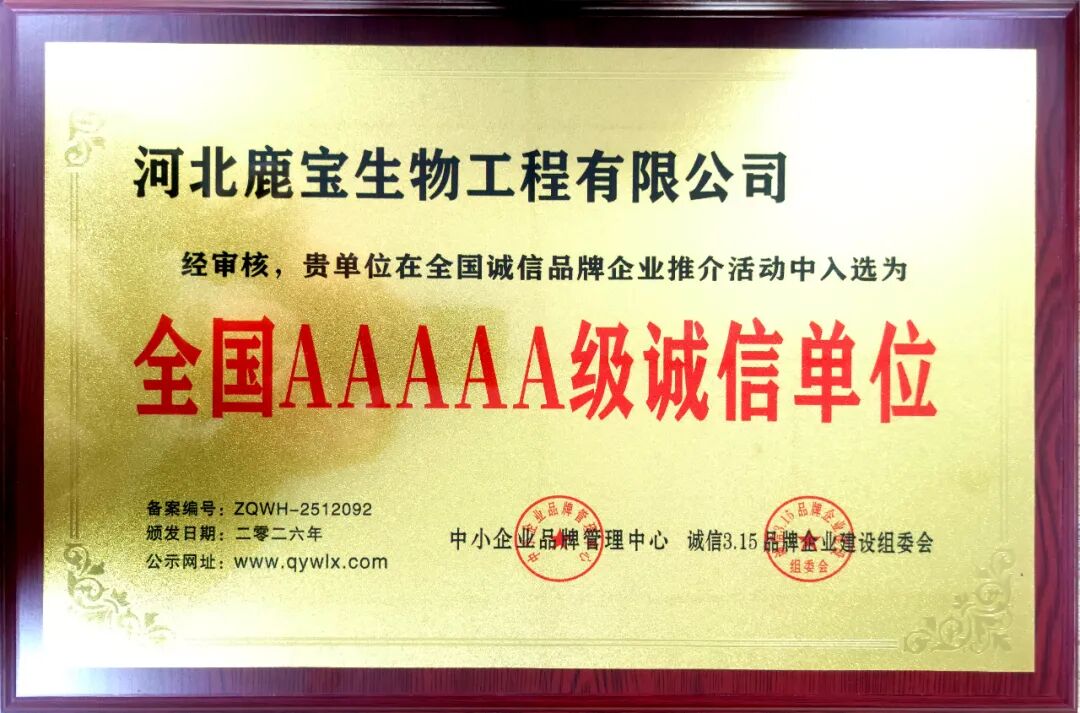 熱烈慶祝河北鹿寶生物工程有限公司,獲評2026年度全國AAAAA級誠信單位(備案單位:中小企業(yè)品牌管理中心,2026品牌宣傳備案編號:ZQWH-2512092)